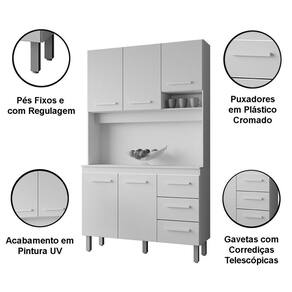 Características do Kit de Cozinha com Nicho para Microondas 5 Portas: - Estrutura em mdp; - Acabamento em pintura UV; - 5 portas com dobradiças metálicas; - 3 gavetas com corrediças telescópicas; - Puxadores em plástico cromado; - Pés com regulagem; - Altura do pé 16 cm; - Não acompanha objetos de decoração e aparelhos eletrônicos;