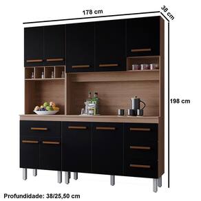 Kit De Cozinha 9 Portas 4 Gavetas Com Nicho Vitorina Savana / Preto O Kit de Cozinha 9 Portas 4 Gavetas com Nicho Vitorina é a escolha perfeita para quem busca praticidade, beleza e espaço na hora de organizar o ambiente. Com design moderno e acabamento sofisticado, ele valoriza sua cozinha, deixando tudo mais funcional e harmonioso. As 9 portas garantem amplo espaço para armazenar utensílios, louças e mantimentos, enquanto as 4 gavetas espaçosas permitem guardar talheres e acessórios de forma organizada. O nicho aberto adiciona um toque decorativo e prático, ideal para eletroportáteis ou objetos de uso diário. Elegante, resistente e completo o Kit Vitorina transforma sua cozinha em um ambiente moderno, acolhedor e cheio de estilo. Dimensões da Cozinha Compacta 9 Portas 4 Gavetas com Nicho: Altura: 198 cm Largura: 178 cm Profundidade: 25,50/ 38 cm