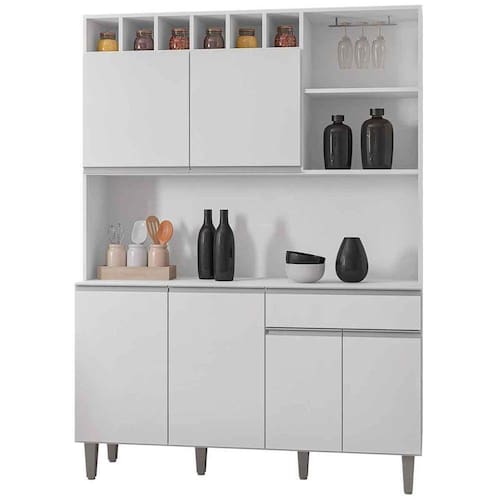 Armários para cozinhas são a solução para organizar aqueles utensílios que ajudam na preparação das refeições. Esses armários ajudam a maximizar o espaço disponível na cozinha. O Kit de Cozinha é ótimo para organizar as suas panelas, bandejas, potes e até mesmo aqueles eletrodomésticos que facilitam o seu dia-a-dia, como liquidificador, fritadeira, espremedor, etc. O Armário Kit de Cozinha possui estrutura em MDP e acabamento em pintura UV, ou seja, tem durabilidade e resistência. Além disso, ele tem 6 portas de bater com dobradiças metálicas, 1 gaveta, nichos e prateleira interna.