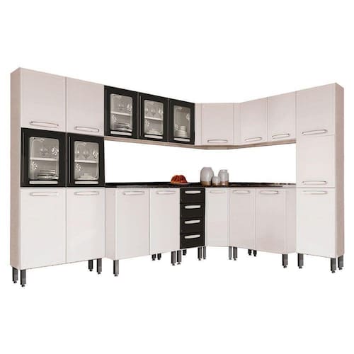 Cozinha Completa Evidence 8 Peças (3 Armários + 3 Balcões + 2 Paneleiros) C8P23 Branco/Preto - Bertolini