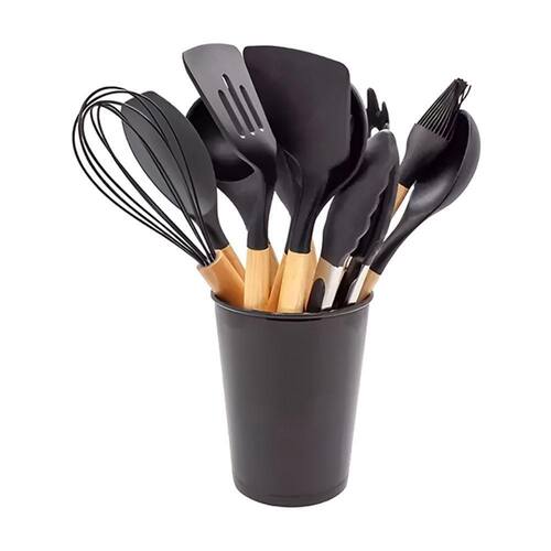 Nosso kit é composto por 12 utensílios essenciais para qualquer cozinha: espátula perfurada, concha, pegador de espaguete, colher perfurada, espátula para wok, espátula de colher, colher sólida, espátula pontuda, pinças, batedor e pincel de confeiteiro. Cada utensílio é feito de silicone premium, seguro para superfícies antiaderentes e com cabos de madeira ergonômicos que proporcionam conforto durante o uso. Além disso, o kit inclui um pote elegante para armazenar todos os utensílios, mantendo sua cozinha organizada e estilosa.