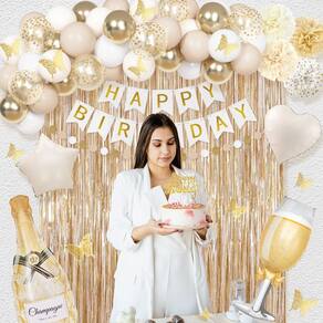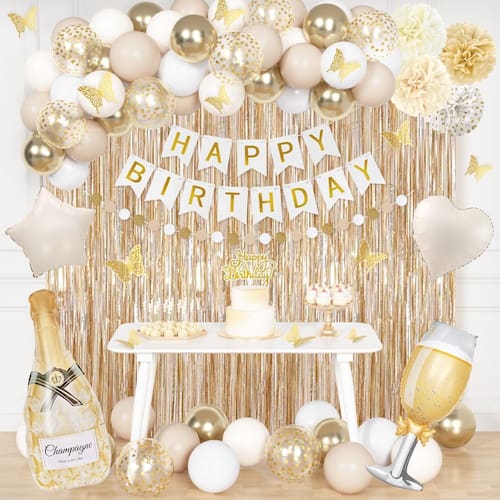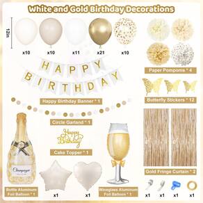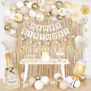 - Decorações de aniversário douradas: incluem 62 unidades de balões, 2 peças de cortina com franjas, 4 peças de pompons de papel, 1 peça de banner de feliz aniversário, 1 peça de banner circular, 4 peças de balões de alumínio, 1 peça de cobertura de bolo, 12 peças de adesivos de borboleta, 1 peça de fita, 100 pontos de cola, 1 peça de nó