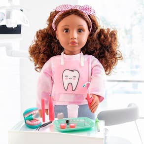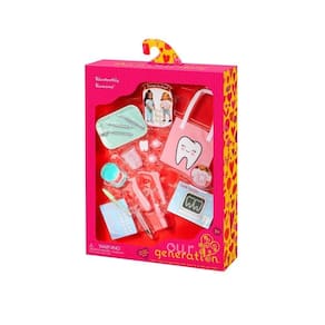 Esse kit de acessórios de cuidados dentários apresenta peças detalhadas e ferramentas realistas que permitem que as crianças explorem e brinquem de serem dentistas das suas bonecas (vendidas separadamente).