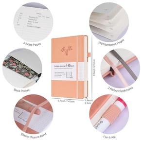 ?Diário de pontos de 140 g/m2?Este caderno pontilhado de capa dura A5 (5,7"* 8,3"* 0,9") apresenta uma capa de couro vegano, 188 páginas numeradas (cada página inclui 1080 pontos: X27* Y40) e 3 páginas de índice, cantos arredondados, 1 bolso traseiro, 2 marcadores de fita, 1 faixa elástica e 1 presilha para caneta. Papel grosso sem ácido de 140 g/m² ajuda você deve criar uma arte melhor sem fantasmas e vazamentos. O design plano de 180 graus facilita a escrita do diário.