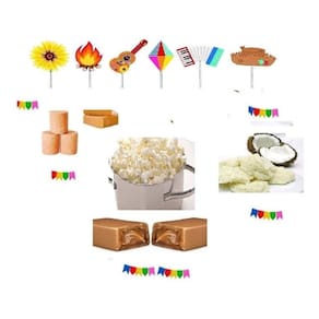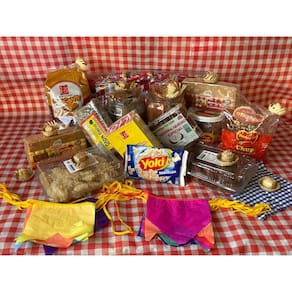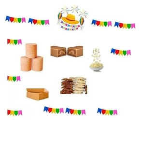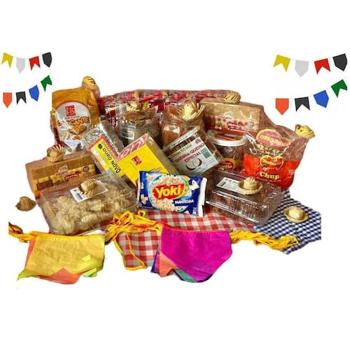 - 3 unidades de Paçoca. - 3 unidades de Doce de Amendoim Formato Liso. - 3 unidades de Cocada. - 1 pacotes de pipoca Popcorn 100 gramas sabor variado - 3 unidades de Pingo de Leite - 3 unidades pé de moleque - 3 chup doce de leite - 3 doce de abobora - 3 pacotes de pipoca doce