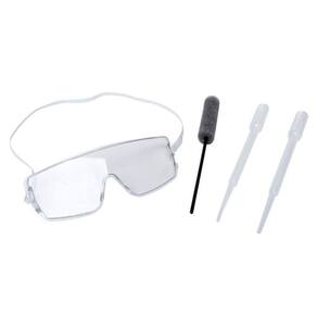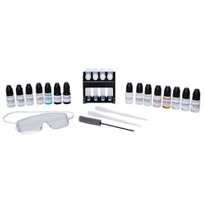 Contém: 15 frascos de 10ml para solução com tampa de segurança (2 frascos opacos), 4 tubos de ensaio com graduação, 2 pipetas, 1 estante para tubo de ensaio, 1 escova de limpeza para tubo de ensaio e 1 óculos de segurança (infantil)