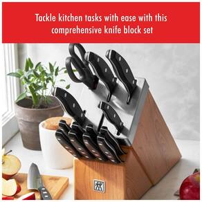 Desfrute de cortes precisos e sem esforço com este conjunto de facas leves e duráveis. As facas de aço inoxidável alemão facilitam o preparo dos alimentos. Pique vegetais grandes e folhas verdes com o cutelo de legumes, corte alimentos com interior macio e exterior resistente com a faca utilitária serrilhada e realize todas as tarefas na cozinha com o santoku de borda oca, que possui pequenas indentações para evitar que os alimentos grudem. As facas TWIN Signature são estampadas com precisão a partir de uma única peça de aço inoxidável de fórmula especial, resultando em facas mais leves. Combinadas com a técnica de endurecimento de gelo exclusiva da ZWILLING, essas lâminas FRIODUR permanecerão mais afiadas por mais tempo. Para garantir um ângulo de corte ideal, a borda afiada controlada a laser é finamente amolada e finalizada à mão. O cabo ergonômico de três rebites embutido com o logotipo da ZWILLING proporciona durabilidade e equilíbrio. E essas facas alemãs, seguras para lava-louças, são convenientemente fáceis de limpar. Inclui Faca para Descascar, Faca para Preparo, Faca Santoku com Borda Oca, Faca de Chef , Faca de Pão , Faca de Carne a Granel, Tesouras TWIN, Bloco Autoafiável de Cinza Natural. Fabricado a partir de aço inoxidável alemão de fórmula especial. Lâmina estampada de uma peça para uma faca mais leve que não sacrifica a resistência. Lâmina FRIODUR endurecida a gelo começa mais afiada e permanece assim por mais tempo. Cabo ergonômico de polímero perfeitamente unido à espiga completa. Cabo tradicional com três rebites embutido com o logotipo da ZWILLING.