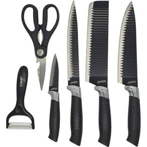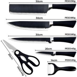 Jogo kit 6 facas chef cozinha inox antiaderente Um conjunto completo de alta qualidade com múltiplas funções este conjunto inclui seis peças com revestimento antiaderente, lâminas afiadas e um design de ângulo com cabo ergonômico para garantir maior precisão, desempenho e uso seguro das lâminas. As peças são feitas de aço inoxidável de alta durabilidade e qualidade. As lâminas são selecionadas para usos específicos, tornando este conjunto adequado para uso em todos os preparativos diários na sua cozinha. Itens inclusos no conjunto: - 1x faca cutelo: perfeita para tarefas que exigem um corte mais preciso e uma alavanca adicional. - 1x faca para frutas ou legumes: ideal para descascar, cortar e fatiar frutas e legumes com facilidade. - 1x faca corte de carnes: com sua lâmina afiada, é a ferramenta ideal para cortar e preparar diversos tipos de carnes. - 1x faca do chef: versátil e indispensável, essa faca permite picar, fatiar e cortar uma variedade de ingredientes com maestria. - 1x tesoura: um auxílio valioso para o corte de ervas, temperos e até mesmo embalagens. - 1x descascador de legumes: desenvolvido para descascar com precisão, tornando a preparação dos alimentos mais rápida e eficiente. O conjunto é enviado em uma caixa, tornando-o não apenas uma ferramenta indispensável na cozinha, mas também uma opção ideal para presentear alguém especial. Ele representa a combinação perfeita de funcionalidade, qualidade e beleza, transformando cada momento na cozinha em uma verdadeira experiência gastronômica. Marca: A