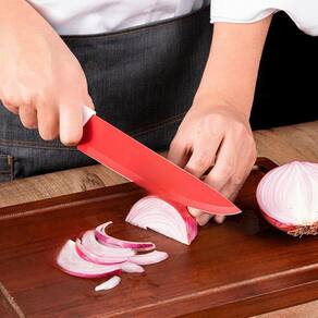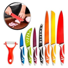 Tenha em sua cozinha um kit completo de facas contando com 7 facas, sendo 1 para pizza, 1 para queijo e junto também um descascador de legumes. Com este kit você terá cortes rápidos e precisos graças a suas lâminas afiadas feitas em aço inoxidável, facilitando no preparo de carnes, peixes, saladas, frutas, queijos e pizzas. Além de tudo, as facas deste kit contam com cabo de alta aderência para melhor manuseio!!