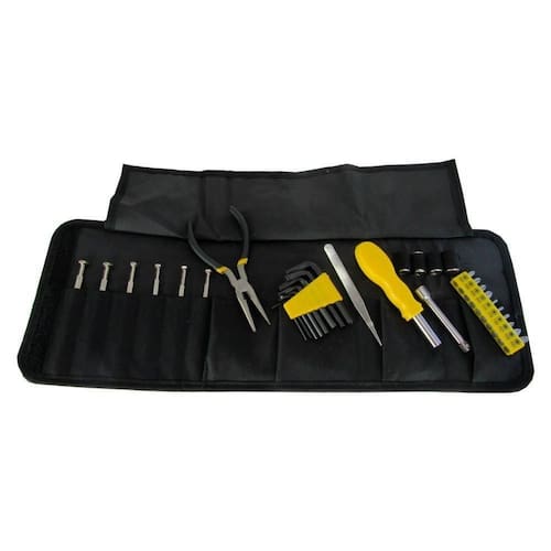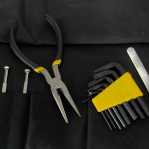 1 Estojo 4 Soquetes 1 Extensor 8 Chaves Allen 1 Pinça 1 Chave encaixe sextavado 1/4 1 Mini alicate bico longo 6 Chaves de precisão 10 Bits