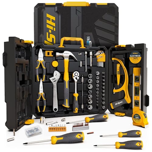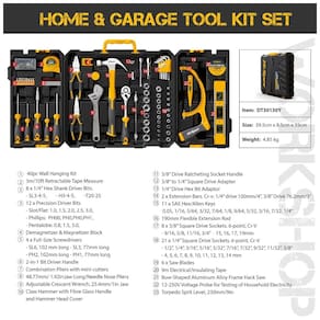AQUI E PRONTO Conclua os trabalhos com mais facilidade e rapidez com o conjunto de kits de ferramentas para casa e garagem de 57 peças Hi Spec. Embalado com as ferramentas manuais mais alcançadas para iniciantes a usuários experientes que precisam de correções agora. Tudo em uma caixa de ferramentas dobrável e grossa com travas de pressão fortes FERRAMENTAS QUANDO MAIS NECESSÁRIAS Faça reparos, manutenção e bricolage em geral. Instale acessórios e acessórios, conserte a fiação, abra eletrodomésticos e eletrônicos quebrados, monte móveis, faça a manutenção de carros e bicicletas. Ou apenas como um kit de backup compacto para a estrada e ao ar livre GRANDES FERRAMENTAS PRÁTICAS Encontre cabos de ferramentas robustos com alças antiderrapantes contornadas que garantem que a força seja aplicada de forma segura e confortável. E por sua dureza extra, o aço cromo vanádio é com um revestimento de cromo ou níquel para um acabamento profissional MAIS POPULARMENTE Puxe, prenda e corte com o alicate combinado, peças de martelo e pregos extraíveis, meça e posicione com precisão com a fita retrátil e o nível de bolha e muito mais com seus acessórios de ferramentas extras Marca: Não Informado