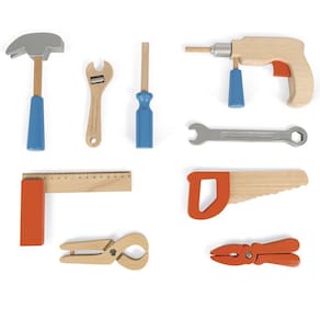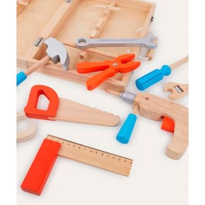 Com 9 ferramentas de madeira projetadas para mãos pequenas, as crianças podem imitar o dia a dia dos adultos de forma segura e lúdica.