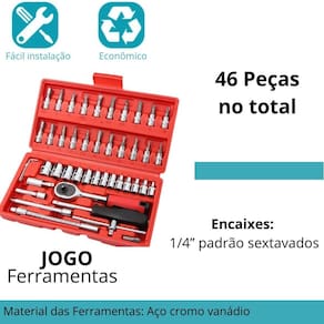 Descrição do anúncio: Explore a praticidade e a qualidade do kit de ferramentas com 46 peças em maleta de termo plástico. Ideal para manutenções domésticas, automotivas e diversas outras aplicações, este conjunto abrangente oferece durabilidade e eficiência em cada ferramenta. Conteúdo da embalagem: 13 soquetes 4 mm a 14 mm 21 soquetes com bits: pontas fenda, hexagonais, philips, pozi, torx 3 chaves hexagonais l 1,5 mm, 2 mm, 2,5 mm 1 cabo fixo 2 extensões 50 mm e 100 mm 1 extensão flexível 150 mm 1 catraca reversível com quick release 1 cabo de força t 1 junta universal 1 bit adaptador 1 maleta de termo plástico disponível em azul, vermelha ou preta Características: Construção robusta em aço cromo vanádio para resistência e durabilidade excepcionais. Soquetes com processo de formação a frio, oferecendo torque 50% maior que o aço carbono. Catraca de 45 dentes para operação rápida e eficiente. Maleta de termo plástico leve e resistente, projetada para organização e proteção das ferramentas. Especificações: 46 peças no total Material das ferramentas: aço cromo vanádio Medidas da maleta: 24x13x5 cm c x l x a Encaixes: 1/4 padrão sextavados Principais perguntas sobre o produto e respostas: 2 os soquetes podem ser em parafusadeiras sim, o kit inclui um adaptador para pontas bits, compatível com parafusadeiras. 4 acompanha parafusadeira no kit não, a parafusadeira mostrada na imagem é meramente ilustrativa para demonstrar o bit adaptador incluso.