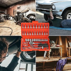Descrição do anúncio: Explore a praticidade e a qualidade do kit de ferramentas com 46 peças em maleta de termo plástico. Ideal para manutenções domésticas, automotivas e diversas outras aplicações, este conjunto abrangente oferece durabilidade e eficiência em cada ferramenta. Conteúdo da embalagem: 13 soquetes 4 mm a 14 mm 21 soquetes com bits: pontas fenda, hexagonais, philips, pozi, torx 3 chaves hexagonais l 1,5 mm, 2 mm, 2,5 mm 1 cabo fixo 2 extensões 50 mm e 100 mm 1 extensão flexível 150 mm 1 catraca reversível com quick release 1 cabo de força t 1 junta universal 1 bit adaptador 1 maleta de termo plástico disponível em azul, vermelha ou preta Características: Construção robusta em aço cromo vanádio para resistência e durabilidade excepcionais. Soquetes com processo de formação a frio, oferecendo torque 50% maior que o aço carbono. Catraca de 45 dentes para operação rápida e eficiente. Maleta de termo plástico leve e resistente, projetada para organização e proteção das ferramentas. Especificações: 46 peças no total Material das ferramentas: aço cromo vanádio Medidas da maleta: 24x13x5 cm c x l x a Encaixes: 1/4 padrão sextavados Principais perguntas sobre o produto e respostas: 2 os soquetes podem ser em parafusadeiras sim, o kit inclui um adaptador para pontas bits, compatível com parafusadeiras. 4 acompanha parafusadeira no kit não, a parafusadeira mostrada na imagem é meramente ilustrativa para demonstrar o bit adaptador incluso. Marca: Não Informado