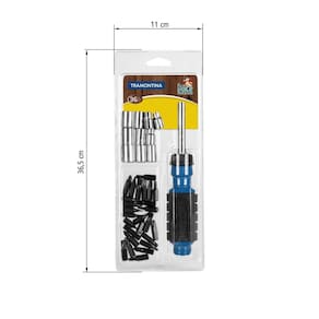 Todo mundo sabe que, hoje em dia, um bom conjunto de ferramentas precisa ter opções variadas e que atendem à diversas necessidades. Esteja preparado para qualquer situação em casa com o Kit de Ferramentas Tramontina 36 Peças! Com ele você tem uma chave com cabo emborrachado, de fácil empunhadura e, nada mais nada menos que 25 ponteiras diferentes e 10 soquetes. É ou não é o kit ideal pra você? Orientações Composição variada que oferece versatilidade na utilização do dia a dia.As ferramentas são produzidas e testadas conforme normas específicas. Características Gerais EAN13 7891114103458 DUN14 17891114103455 NCM 8204.20.00 Peso Líquido 0,3800 kg. Peso Bruto 0,3800 kg. Metragem 0,001606 m³. Dimensões Embalagem (Compr. X Larg. X Alt.) 365x 110x 40 mm. Observações Use óculos, luvas e outros equipamentos de proteção de acordo com a tarefa a ser executada. Mantenha ferramentas de corte longe do alcance de crianças. Mantenha as ferramentas sempre limpas para um melhor agarre, pois usá-las sujas com graxa ou óleo pode causar acidentes. Armazene em local limpo e seco.