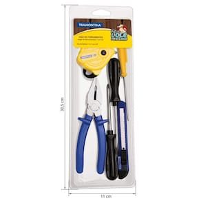 Quem se compromete em realizar os trabalhos com qualidade precisa ter sempre por perto as melhores ferramentas. Para isso, você pode contar com o Kit de Ferramentas Tramontina com Alicate Chaves de Fenda Estilete e Trena 6 Peças. São inúmeros tipos de utilização: desde medir, cortar até apertar ou afrouxar parafusos. Todas as peças são produzidas e testadas conforme normas específicas. Um verdadeiro Top 6 para sua caixa de ferramentas! Orientações Composição variada que oferece versatilidade na utilização do dia a dia.As ferramentas são produzidas e testadas conforme normas específicas. Características Gerais EAN13 7891114072778 DUN14 17891114072775 NCM 8205.40.00 Peso Líquido 0,2100 kg. Peso Bruto 0,4100 kg. Metragem 0,001007 m³. Dimensões Embalagem (Compr. X Larg. X Alt.) 305x 110x 30 mm. Observações Use óculos, luvas e outros equipamentos de proteção de acordo com a tarefa a ser executada. Mantenha ferramentas de corte longe do alcance de crianças. Mantenha as ferramentas sempre limpas para um melhor agarre, pois usá-las sujas com graxa ou óleo pode causar acidentes. Armazene em local limpo e seco.