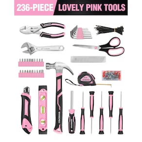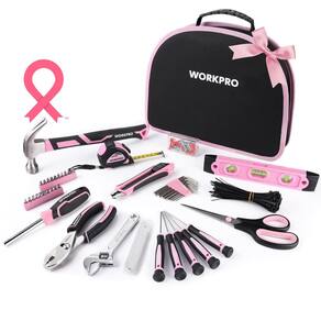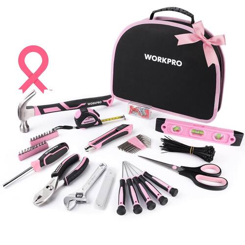 WORKPRO Kit de ferramentas rosa - Conjunto de ferramentas rosa com bolsa redonda fácil de transportar, kit de ferramentas domésticas perfeito para bricolage, manutenção doméstica - fita rosa - Fita rosa - A WORKPRO Tools está doando desta compra para a National Breast Cancer Foundation, Inc. A NBCF está ajudando as mulheres agora, fornecendo serviços de detecção precoce, educação e suporte para pessoas afetadas pelo câncer de mama - Conjunto de ferramentas rosa de 236 peças – Este conjunto de ferramentas domésticas vem com todas as ferramentas mais úteis e necessárias para manutenção doméstica e uso diário. Inclui um martelo, nível, alicate, chaves de fenda e brocas magnéticas, chaves, braçadeiras, faca utilitária e muito mais - Ideal para manutenção doméstica - Nosso kit de ferramentas manuais é perfeito para bricolage ou reparo e manutenção doméstica. Possui todos os equipamentos e ferramentas necessários e vem com uma bolsa redonda fácil de transportar que permite armazenamento simples e flexibilidade adicional - Altamente resistente e seguro de usar – todas as ferramentas domésticas atendem ou excedem as especificações ANSI (American National Standards Institute) para maior segurança. Não precisa se preocupar com suas ferramentas danificadas ou quebradas durante o uso - Acabamento cromado anticorrosivo – Todas as ferramentas rosa são feitas com aço de liga de cromo forjado revestido com um acabamento cromado que protege contra corrosão. Não precisa se preocupar em deixar suas ferramentas ao ar livre, pois nossas ferramentas são resistentes à ferrugem