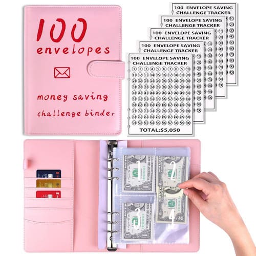 Kit de fichário AIERSA 100 envelopes Money Saving Challenge, divertido organizador de livros com envelopes de dinheiro para 100 dias de enchimento de dinheiro, orçamento e substituição de caixa para economizar dinheiro, 1 conjunto rosa