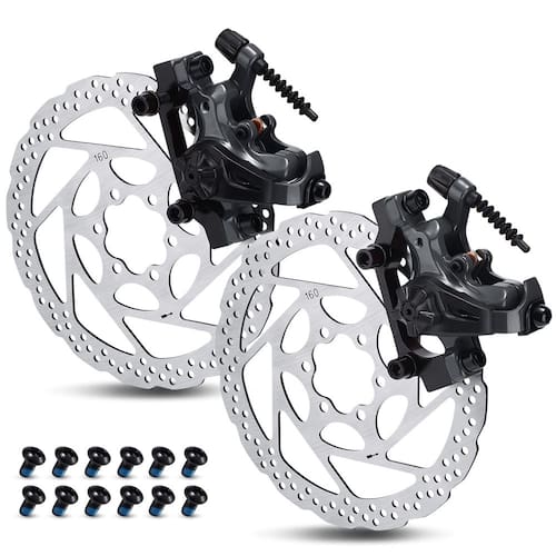 Especificações: Material: liga de alumínio + aço inoxidável Cor: Preto/Vermelho Pinças de freio: F160/R140 para dianteiro; F180/R160 para traseira (montagem pós-montagem de 51 mm e 75 mm) Rotor: 160 mm de diâmetro, 2 mm de espessura, mesmo na frente e atrás A embalagem inclui: 2 pinças de freio. Rotor de 2 x 160 mm 12 parafusos - ?Durável e de alta resistência?-- Este kit de freio a disco mecânico é construído usando liga de alumínio de alta qualidade, não apenas sem ranger devido à fricção dos freios, resistência a altas temperaturas e antiquebra, não será afetado por climas extremos, como chuva e neve. - ?Pinça de freio a disco de pistão duplo?-- Esta é uma pinça de freio a disco mecânico de dupla face, onde ambas as pastilhas atuam para fornecer força de aperto uniforme e precisa, melhorando o desempenho de frenagem em designs de pistão único, enquanto também evita a deformação do rotor. - ?Rotores de disco de 6 parafusos de aço inoxidável?-- Rotores ultraleves que perdem peso e destroem trilhas, enquanto ainda alcançam potência de frenagem e modulação superiores. Com enormes orifícios de ventilação em toda a aranha e furos perfurados através do seu adesivo de contato para ajudar tanto na verificação de calor quanto na redução de peso. - ?Amplamente compatível?-- Vem com fixadores de aço resistente e funciona com qualquer cubo compatível com 6 parafusos. Adequado para a maioria das bicicletas de montanha, bicicleta de estrada e sistema de freio a disco mecânico. - ?Pacote e nota?-- Pacote com 1 par de pinças de freio a disco mecânicas (F160 R140 para frente, F180 R160 para traseira), 2 peças de rotores de disco de 6 parafusos de 160 mm, 12 parafusos de titânio. Verifique as especificações na imagem do produto 2 e 3 para garantir que atenda aos seus requisitos para um ajuste adequado.