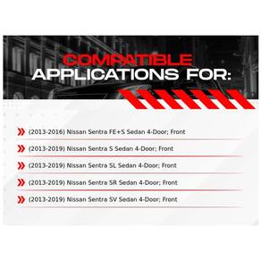 - Aplicações compatíveis para: (2013-2016) Nissan Sentra FE+S Sedan 4 portas; Dianteiro, (2013-2019) Nissan Sentra S Sedan 4 portas; Dianteiro, (2013-2019) Nissan Sentra SL Sedan 4 portas; Dianteiro, (2013-2019) Nissan Sentra SR Sedan 4-Porta; Dianteira, (Nissan Sentra SV Sedan 4 portas Nissan Sentra 2013-2019; Dianteiro