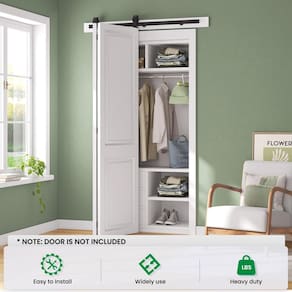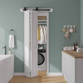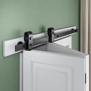 SMARTSTANDARD Kit de ferragens para porta de celeiro deslizante de 86 cm, kit de trilho duplo dobrável de 0,9 m para portas duplas de lavanderia de despensa de armário de 38 cm - suave e - Maximize seu espaço: nosso kit de porta de celeiro dobrável é perfeito para espaços limitados, requer apenas 15 a 20 cm ao lado da abertura da porta. Uso versátil para vários tipos de portas e adequado para vários espaços de estar, incluindo lavanderia, armário, escritório e muito mais. - Qualidade excepcional: construído em aço preto resistente, oferecendo robustez, resistência ao desgaste e à corrosão. Os rolos e trilhos são projetados para minimizar o atrito, facilitando abrir e fechar a porta. - Instalação sem complicações: vem com um manual fácil de usar com instruções sequenciais. Se você é um entusiasta de bricolage ou prefere ajuda profissional, estamos aqui para ajudá-lo online, garantindo um processo de configuração suave. - Dimensões: Espessura da porta: 2,5 cm ~ 3,5 cm, largura por porta: máx. 38 cm; Capacidade de peso da porta: 81 kg. O comprimento do trilho deve ser tamanho da abertura da porta + 10 cm, pelo menos 15 cm de folga necessária da parte superior da porta e do teto. - Listas de pacotes: 1 trilho de 2,8 m, 3 espaçadores de trilhos, 1 rolo fixo, 1 rolo ajustável, 1 suporte de bloqueio de rolo, 1 placa pivô inferior e manga, 2 placas conectoras superiores, 3 dobradiças de extremidade, 3 chaves hexagonais. Todas as outras ferragens necessárias estão incluídas. (Observação: Porta não incluída).