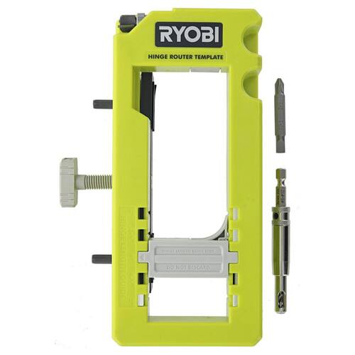 Ryobi A99HT3 Kit de instalação de dobradiça de porta/molde de encaixe - Não há necessidade de parafusos ou pregos graças ao grampo integrado que não danifica que permitirá que esta ferramenta se encaixe em espessuras de porta padrão - Corte para dobradiças arredondadas ou quadradas graças à inserção de plástico removível - Funciona para todas as espessuras e comprimentos de dobradiça padrão (0,6 cm ou 5/20.3 cm de espessura e 3 a 12,7 cm de comprimento) - 3 brocas incluídas – 1 fresa com ponta de carboneto, 1 broca de dobradiça autocentralizada, 1 broca de chave de fenda dupla PH2/8-10SL - Funciona com roteadores compactos e completos