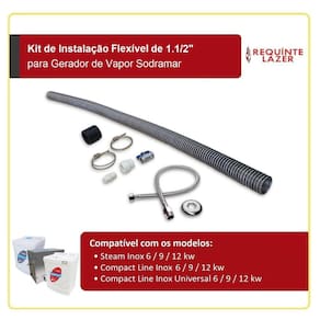 O Kit de Instalação Flexível em Aço Inox de 1.1/2" foi preparado especialmente para os geradores de vapor da Sodramar e possui todos os componentes necessários para que a instalação hidráulica do aparelho seja feita corretamente. Compatível com os modelos Steam Inox, Compact Line Inox Universal e Compact Line Inox de 6, 9 e 12 kw, é composto por 01 registro para drenagem, 01 mangote de borracha, 02 abraçadeiras, 01 mangueira flexível de 60 cm fabricada em aço inox 304 e 01 tubo flexível de aço inox com 1,25 m de comprimento e diâmetro de 1.1/2".