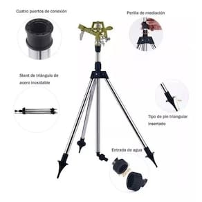 CARACTERÍSTICAS RESIDENCIAIS OU DOMÉSTICAS, LIVIANAS, DE TRANSPORTE E FACILIDADE DE MANIPULAÇÃO. -Material do aspersor: bronze\ N Material do tripé: alumínio\ N Altura do tripé: 45 a 85 centímetros (ajustável)\ N-aspersor de ângulo N\ N ajustável entre 25° e 360°\ N Botão de controle de distância 6-12,2 m de raio\ N-Área de irrigação: 113 a 467 metros quadrados - Protetor defletor, permite reduzir a cobertura. Anéis de atrito para regular o ângulo de irrigação. -Pino para círculo de irrigação total ou parcial - Inclui conector de mangueira de 1/2 polegada