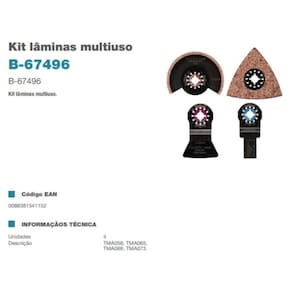 - 1 TMA058 - Lâmina Bimetal; - 1 TMA065 - Para cortar metal; - 1 TMA069 - Lamina Para argamassa - 1 TMA073 - Lâmina Para argamassa e fibra de vidro.