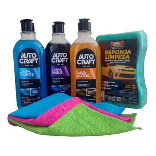 Kit Limpeza Automotiva Proauto- Com esse Kit você garante a melhor limpeza para seu veículo Contém: 01 Lava Autos Autocraft 500ml +01 Limpa Pneus Autocraft 500ml +01 Limpa Vidros Autocraft 500ml + 03 Pano de Microfibra +01 Esponja de LimpezaO Lava Autos Autocraft: Limpa e protege o seu veículo, formulado com tensoativos biodegradáveis, o Lava Autos Autocraft limpa a superfície do veículo e cria barreira contra de sujeiras e resíduos de poluição.O Limpa Pneus Autocraft é um produto viscoso de alto rendimento que proporciona brilho e beleza aos seus pneus. Sua nova fórmula cria uma película protetora nos pneus que evita o ressecamento e conserva contra as ações do tempo reforçando a aparência de limpeza no seu carro por muito mais tempo. O Limpa Vidros Autocraft possui tensoativo eficiente para uma limpeza rápida e ação desengordurante, proporcionando transparência total para seu vidro. Além disso pode ser Utilizado no reservatório. Esponja De Limpeza é sua melhor escolha, além de ter a melhor absorvência também te proporciona limpeza prática e não risca. Seu tamanho é de 12 cm X 17 cm X 5 cm. O Pano de Microfibra vem com três cores rosa, verde e azul , é supermacio, não risca, não solta fiapos. Pode ser Utilizado para todo o tipo de superfície. Kit Limpeza Automotiva Proauto- Com esse Kit você garante a melhor limpeza para seu veículo Contém: 01 Lava Autos Autocraft 500ml +01 Limpa Pneus Autocraft 500ml +01 Limpa Vidros Autocraft 500ml + 03 Pano de Microfibra +01 Esponja de LimpezaO Lava Autos Autocraft: Limpa e protege o seu veículo, formulado com tensoativos biodegradáveis, o Lava Autos Autocraft limpa a superfície do veículo e cria barreira contra de sujeiras e resíduos de poluição.O Limpa Pneus Autocraft é um produto viscoso de alto rendimento que proporciona brilho e beleza aos seus pneus. Sua nova fórmula cria uma película protetora nos pneus que evita o ressecamento e conserva contra as ações do tempo reforçando a aparência de limpeza no seu carro por muito mais tempo. O Limpa Vidros Autocraft possui tensoativo eficiente para uma limpeza rápida e ação desengordurante, proporcionando transparência total para seu vidro. Além disso pode ser Utilizado no reservatório. Esponja De Limpeza é sua melhor escolha, além de ter a melhor absorvência também te proporciona limpeza prática e não risca. Seu tamanho é de 12 cm X 17 cm X 5 cm. O Pano de Microfibra vem com três cores rosa, verde e azul , é supermacio, não risca, não solta fiapos. Pode ser Utilizado para todo o tipo de superfície.
