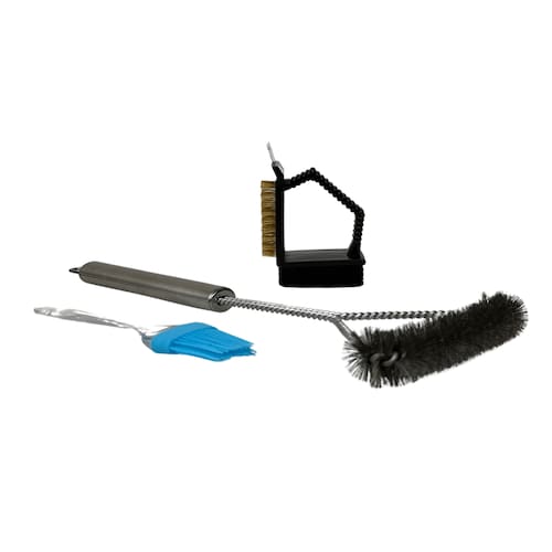 Itens: Pincel, esponja com escova e espátula, escova grande em T.Peso total: 337 g.Dimensões: Variadas conforme item (detalhes acima).Material: Silicone, fio de cobre e aço.Por que escolher o Kit de Limpeza para Churrasqueira da Broiler?