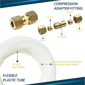 - Conteúdo: Kit de instalação completo, inclui tubo de linha de plástico de 25 pés (25 pés) de 1/10.2 cm, uma válvula de sela ajustável autoperfurante de latão, um adaptador de compressão de linha de 1/10.2 cm.