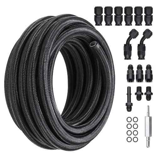 VEVOR Kit de linha de combustível 6AN, kit de mangueira de combustível de 7,5 m, kit de linha de combustível PTFE trançado de aço inoxidável de 5/16", kit de encaixe de extremidade de mangueira - Materiais premium: Feito com uma estrutura robusta de camada dupla composta de nylon externo e trança de fio de aço inoxidável médio, envolvendo firmemente uma camada interna de PTFE. Este design alivia a pressão interna, reduz o desgaste, aumenta a flexibilidade e a resistência mecânica. Nosso kit de linha de combustível 6an é projetado para diesel, gasolina, fluido de transmissão e E85. - Aplicações versáteis: Nosso kit de mangueira de combustível encontra utilidade em vários sistemas de combustível automotivos, incluindo refrigerador de turbina, transmissão, retorno de óleo e tubulações de resfriamento de transmissão, tornando-o ideal para serviços de transporte de combustível. - Durabilidade excepcional: com uma construção de 3 camadas, nossa linha de combustível trançada apresenta uma forte pressão de ruptura, com uma pressão máxima de trabalho de 500 psi. Ele opera em temperaturas que variam de -60 °C a 230 °C, garantindo confiabilidade mesmo em condições extremas. - Vários encaixes incluídos: a linha de combustível trançada possui diâmetro interno de 5/16", diâmetro externo de 1,2 cm e um comprimento generoso de 7,6 m; nosso kit de encaixe de extremidade de mangueira de combustível está equipado com 15 acessórios, perfeitamente compatível com a extremidade da mangueira giratória 6AN. - Vedação à prova de vazamento: para garantir a prevenção de vazamentos a longo prazo e uma vedação consistente, o kit de linha de combustível vem com 8 anéis de vedação que garantem uma conexão firme e sem problemas.