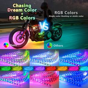 Luzes LED Dream Color Chasing RGB + IC. O novo design do kit de iluminação LED para motocicleta possui um CI de controle independente, suportando RGB estáticas e 256 modos de perseguição de sonhos, como perseguição, corrida, fluir, pular e muito mais, criando um espetáculo encantador como se as luzes estivessem se perseguindo umas às outras. Em comparação com outras luzes LED que suportam apenas cores estáticas, este kit de luzes LED para motocicleta apresenta um show de luzes deslumbrante, criando uma atmosfera romântica e mágica. Ele garante que onde quer que você ande de motocicleta à noite, você atrairá inúmeras atenções e elogios. - Luz LED DreamColor Chasing RGB+IC: o novo design do kit de iluminação LED de motocicleta possui um controle IC independente, suporta estáticas RGB e modo de perseguição de 256 sonhos, como perseguir, correr, fluir, pular e muito mais, criando um espetáculo encantador como se as luzes estivessem se perseguindo umas às outras. Em comparação com outras luzes LED que suportam apenas cores estáticas, este kit de luz LED de brilho para motocicleta apresenta um show de luzes deslumbrante, definindo uma atmosfera romântica e mágica - Ultra brilho: as tiras de luz LED de efeito de perseguição de motocicleta são feitas com 144 contas de LED SMD 5050 RGB de alto brilho, proporcionando uma área de iluminação maior e mais brilhante. É selado externamente usando um processo de envasamento totalmente à prova d'água, aumentando a transmissão de luz em 56%. O efeito à prova d'água atinge IP 68, permitindo que funcione normalmente mesmo em condições adversas como chuva, neve, lama e ambientes off-road. Observe que o controle não é à prova d'água - 2 métodos de controle: o kit de brilho de motocicleta oferece operação conveniente com controle inteligente de aplicativo e um controle remoto RF de 21 teclas. Com essas opções de controle, você pode facilmente ligar as luzes, ajustar 16 milhões de cores RGB estáticas, escolher entre 256 modos de perseguição, usar o modo de música, definir temporizadores, controlar a velocidade e ajustar o brilho. Digitalize o manual do usuário ou o código QR na caixa de controle para baixar o aplicativo, o kit de luz Underglow para motocicleta também é compatível com iOS e Android. Nome do aplicativo: happylighting. Esta configuração amigável permite que você tenha controle completo sobre as luzes LED, tornando-as totalmente personalizáveis de acordo com suas preferências - Função de aviso de freio e direção à esquerda, direita: o kit de luz solar de perseguição de motocicleta possui funções de aviso de freio e seta. Quando você aplica os freios, todas as luzes LED emitem luz vermelha. Quando você ativa o seta, as luzes LED do mesmo lado emitem luz amarela. Esta função serve como um aviso para os veículos atrás de você, melhorando significativamente sua segurança ao dirigir. Este recurso é opcional e não afeta o funcionamento normal de outras funções - Fusível e interruptor de alimentação: o kit de luzes de motocicleta vem com um fusível embutido de 5 A, que corta automaticamente a energia se a corrente exceder 5 A, garantindo a proteção do seu veículo. As luzes LED para motocicletas têm um botão de interruptor de energia adicional. Quando sua motocicleta estiver desligada, pressionar o botão desconectará completamente a conexão com a bateria, resultando em zero consumo de energia. Se você tiver uma bicicleta maior, talvez seja necessário comprar o cabo de extensão de luzes LED para motocicleta. Cabo de extensão LED de 4 pinos ASIN: B0CBMP153S - Serviço pós-venda sem preocupações: oferecemos serviço pós-venda confiável 24/7 e suporte ao cliente vitalício para sua tranquilidade