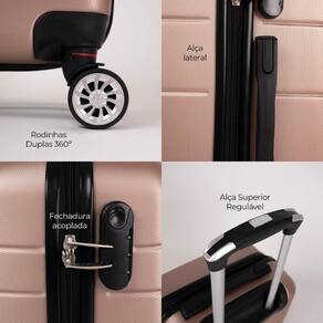 Fabricada em ABS, essas malas são resistentes e duráveis, equipada com 4 rodas duplas 360 que proporcionam fácil manobrabilidade. Possui cadeado fixo com senha para segurança, carrinho com ajuste de altura para maior conforto e alças de mão e lateral na mala média. No interior, conta com cinta elástica e divisória em zíper para manter tudo organizado. Além disso, a mala pequena é aprovada pela Agência Nacional de Aviação Civil (ANAC) para ir a bordo, tornando-a a escolha perfeita para suas viagens.