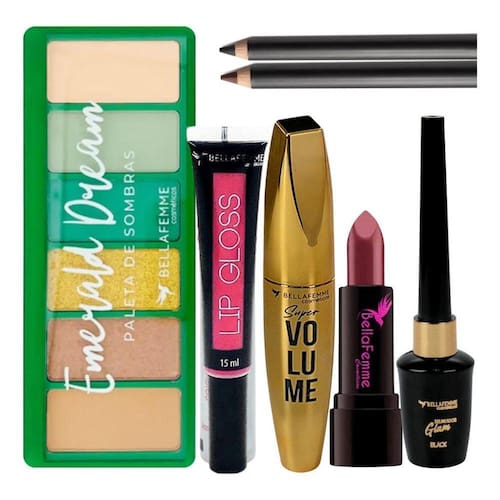 - 01 paleta de sombras - 01 lip gloss - 01 rimel - 01 batom - 01 delineador - 01 lapis de olho preto - 01 lapis de olho marrom
