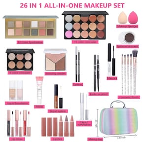 Componentes Incluídos Paleta de sombras (20 cores com pincel dupla ponta), base líquida, primer, 2 paletas de corretivo (21 tons), pó bronzeador, máscara para cílios, delineador líquido, delineador em lápis, sombra líquida, lápis para sobrancelhas, batons, pincéis variados, estojo portátil