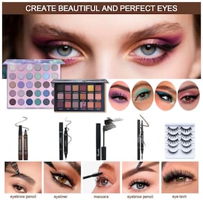 Itens inclusos (conjunto): Paleta de sombras, pó solto, brilho labial, batom, creme corretivo, pincéis de maquiagem, paleta de corretivos, pó para sobrancelhas, pó iluminador para área dos olhos, corretivo, delineador, balm labial, máscara para cílios, base, esponja/powder puff, cílios postiços