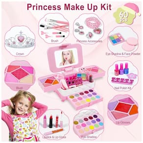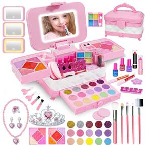 Conjunto de maquiagem de 57 peças para meninas: Esta maquiagem feminina vem com tudo que você precisa. Inclui sombra x 15, brilho labial x 5, blush x 5, pó facial x 2, batons x 2, esmaltes labiais x 2, pincéis x 5, pincéis de blush x 2, pincéis de brilho labial x 2, esponjas de pó x 2, brincos de gema x 2, coroa de princesa x 1, colar de gema x 1, anel de gema x 1, esmalte de unha x 3, separador de dedo do pé x 1, lixa de unha x 1, espelho iluminado x 1, caixa de cosméticos x 1, caixa de presente x 1, manual do usuário x1, chave de fenda x 1.