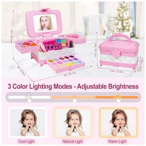 Espelho de maquiagem LED de 3 cores: Esta maquiagem infantil com espelho de maquiagem LED, existem 3 modos de iluminação de cores (branco/quente/natural). Basta tocar no botão no meio do espelho para acender a luz e um toque curto mudará o modo. Deixe sua princesinha escolher uma cor favorita e desbloquear o novo mundo da cosmética infantil!