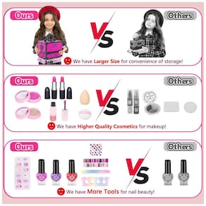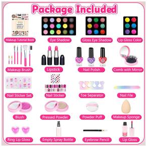 Brinquedos de maquiagem de segurança de material: O kit de maquiagem infantil é feito de material de alta qualidade, durável e renovável que atende aos padrões de brinquedos infantis internacionais (certificados CPSIA, CPC, ASTM) para segurança e foi testado no corpo, pode haver uma fragrância leve e inofensiva quando a caixa de maquiagem acaba de ser aberta, mas pode ser usada com confiança. Fácil de lavar com água e sabão, não deixa manchas na pele, roupas ou móveis. Amigável para as crianças se maquiarem.