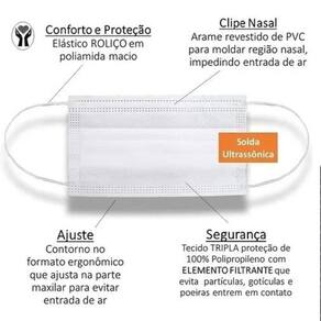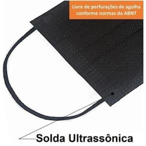 Produto de tripla camada com solda ultrassônica sem perfurações de agulhas de costura sem furos na máscara - conforme normas da ABNT. Elástico roliço fino