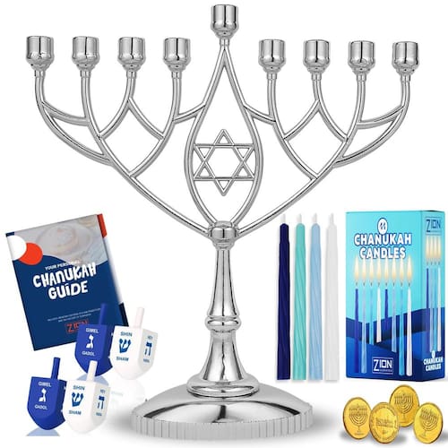 O pacote de valor excepcional do Hanukkah. Colocamos a melhor mercadoria Chanukah neste grupo econômico. Obtenha todos os itens essenciais do Hanukkah para uma criança, um estudante na faculdade, você e seus amigos. Este kit inclui o melhor de tudo; MENORAH: uma menorá geométrica de tamanho completo recém-projetada, corpo de metal sólido, tem 23 cm de altura, peso resistente com borracha antiderrapante sob a base para segurança extra. Uma menorá que vai durar por muitos anos. 23 cm A x 21 cm L x 6 cm D. Velas: As velas incluídas são uma caixa de 44 velas festivas multicoloridas que queimam por pelo menos meia hora ou mais. Novo! GUIA COMPLETO DE HANUKKAH: NOVO! 8 seções com tudo sobre Chanukah. Vestidos: 4 dos nossos novos Draydels médios de madeira que giram perfeitamente e têm a transliteração em inglês das letras hebraicas. Moedas de gel de chocolate: inclui um saco de moedas de chocolate ao leite belga de qualidade, sem nozes, simplesmente o melhor, não há moedas de Hanukkah com melhor sabor como estas. - Pacote de valor excepcional com coisas realmente boas! Todos os equipamentos de Hanukkah em 1 pacote. - Pare a caça aqui, este conjunto tem tudo. Qualidade, valor, preço. - Uma menorá robusta e sólida de tamanho completo, caixa de 44 velas coloridas de Hanukkah, 4 Dreidels médios com transliteração em inglês, saco de soberbas moedas de leite de chocolate de Hanukkah belga (moedas sem nozes) - Novo! Guia completo de Hanukkah, 8 seções com tudo sobre Chanucá.