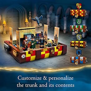 Personalizado e portátil, o porta-malas mágico LEGO Harry Potter Hogwarts (76399) para maiores de 8 anos está repleto de uma mistura mágica de lugares personalizáveis e pessoas dos filmes de Harry Potter. Coloque a diversão de Hogwarts nas mãos das crianças.Assim como os icônicos baús dos alunos de Hogwarts, as crianças podem adicionar diferentes cores da Casa de Hogwarts e adesivos divertidos para tornar esta versão de LEGO em tijolo sua. Entre o conteúdo está uma grande seleção de peças de minifiguras - incluindo uma variedade de cabelos e diversos tons de pele - para que as crianças possam construir até 5 personagens dos filmes de Harry Potter e projetar seus próprios alunos de Hogwarts. Uma grande variedade de móveis e acessórios personalizáveis dos filmes dá às crianças ideias e inspiração para dar vida às suas aventuras imaginativas de Hogwarts. Há também 3 histórias de filmes clássicos para jogar: a Cerimônia de Seleção; um banquete do Grande Salão; e a Sala Comum. Quando a ação termina, tudo se arruma perfeitamente no porta-malas para que as crianças possam levar a magia de Hogwarts aonde quer que vão.