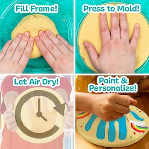 Feito por mim! Criações para esculpir e pintar em massa de areia! Molde sua própria pedra estampada à mão, kit de pedra impressa à mão de 7 polegadas DIY, trampolins sem bagunça, atividade de estadia, presente de lembrança para crianças de 4 anos ou mais — MOLDE UMA PEDRA PERSONALIZADA ESTAMPADA À MÃO de 7 polegadas: de massa de areia a um molde de lembrança e tintas acrílicas vibrantes, este kit inclui tudo o que você precisa para criar uma peça de decoração especial de 7 polegadas que você apreciará para sempre. - SEM BAGUNÇA: troque o gesso bagunçado por uma alternativa menos bagunçada, totalmente nova e muito satisfatória: Sand Dough! Este kit exclusivo de trampolim usa uma areia fofa e divertida que seca muito para preservar para sempre os momentos mais significativos de sua vida! - SEGURO PARA CRIANÇAS: A massa de areia não é tóxica e é feita com ingredientes de alta qualidade. - PINTE E DECORE: Use o pincel e 6 cores brilhantes para dar vida à sua pedra. Explore a mistura de cores ao combinar cores para obter novos tons ou adicionar branco para deixar as cores mais claras! - O kit inclui: 6 potes de tinta (1 vermelho, 1 amarelo, 1 verde, 1 azul, 1 laranja, 1 branco, 2,2 ml cada), 1 kg de massa de areia, 1 pincel, molde de pedra (7 x 7 pol.), instruções fáceis de seguir