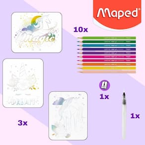 Kit de Pintura Aquarelável Aqua'Art Maped Magico Nome: Unicornios Este kit encantador é perfeito para crianças que adoram unicórnios e Dinoussauros, sonham com um mundo cheio de cores e fantasia. O kit inclui uma paleta de aquarelas vibrantes, pincéis de alta qualidade e folhas de papel com lindas ilustrações e paisagens mágicas.