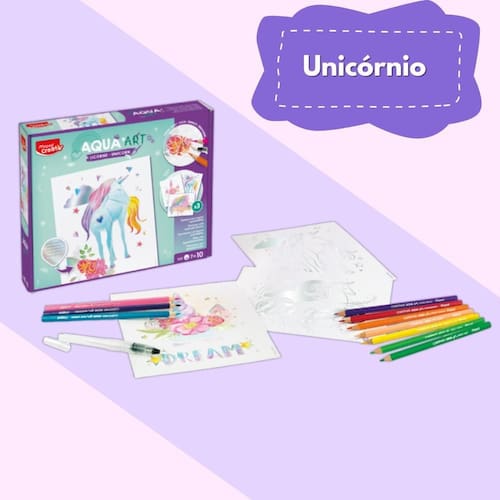 Kit de Pintura Aquarelável Aqua'Art Maped Magico Nome: Unicornios Este kit encantador é perfeito para crianças que adoram unicórnios e Dinoussauros, sonham com um mundo cheio de cores e fantasia. O kit inclui uma paleta de aquarelas vibrantes, pincéis de alta qualidade e folhas de papel com lindas ilustrações e paisagens mágicas.