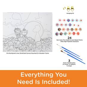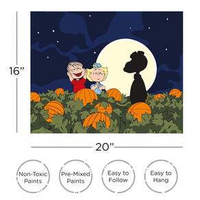 - KIT DE PINTURA ART BY NUMBERS 16 x 20: Os fãs de Peanuts vão se divertir pintando esta obra-prima de 16 x 20 com imagens de Peanuts do clássico show It's The Great Pumpkin Charlie Brown. Este kit exclusivo de arte por números tem uma tela pré-esticada que mede 16 x 20 polegadas, vem com 24 tintas, 3 pincéis e está pronto para pendurar. A caixa tem uma alça para facilitar o transporte até onde quer que a inspiração o leve.