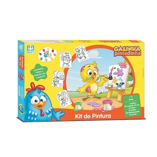 Kit De Pintura Com Cavalete - Galinha Pintadinha - Nig Brinquedos Kit de Pintura com Cavalete - Galinha Pintadinha - Nig Brinquedos: este conjunto de pintura inspirado na Galinha Pintadinha foi produzido com todo amor e carinho para que as crianças consigam se desenvolver e despertem seu lado artístico enquanto brincam de colorir. Os pequenos poderão criar novas cores misturando as tintas. O Kit de Pintura Galinha Pintadinha vem acompanhado de vários acessórios para tornar a brincadeira de pintar, colorir e desenhar muito mais divertida. Detalhes:- 01 Cavalete com 45 centímetros de altura- 04 telas para desenhar- 06 tintas guache para colorir- 01 paleta de suporte das tintas- 01 pincel para criar os desenhos- Super resistente para tornar a brincadeira de pintar e de escolinha mais divertidas.- Cavalete, paleta e telas são fabricadas em madeira (MDF)Informações: - Produto: Kit de Pintura com Cavalete Galinha Pintadinha- Marca: Nig Brinquedos- Coleção: Galinha Pintadinha- Tipo: Kit de Pintura Infantil com Cavalete- Categoria: Artes e Atividades- Tamanho: cavalete - 45 cm de altura- Conteúdo: 13 acessórios- 01 cavalete em madeira- 04 telas em madeira- 01 paleta em madeira- 06 tintas guache- 01 pincel- Recomendação: para crianças a partir de 04 anos de idadeEspecificações:- Referência: 0732- Código de Barras: 7896200707329- Embalagem (C x A x L): 48 x 30 x 05 cm- Embalagem (Peso): 1.3 kg- Composição / Material: Madeira reflorestada- Registro: CE-BRI/IQB-446 NM 300/2002- Certificado: Órgãos Autorizados - OCPS (Organismos de Certificação de Produtos)Benefícios de brincar:- Eleva a autoestima- Exercita a memória- Estimula o raciocínio- Exercita o imaginário- Desenvolve a criatividade- Desenvolve percepção visual- Desperta a atenção e curiosidade- Desenvolvimento neuropsicológico- Estimula habilidades motoras básicas- Incentiva a comunicação e linguagem- Desenvolve aspectos emocionais e afetivo- Estimula o reconhecimento de formas e coresAviso: - As imagens são meramente ilustrativas- Os pesos, tamanhos e medidas são aproximados- As cores e estampas dos produtos podem ter variações- As informações são de responsabilidade do fabricante ou fornecedor
