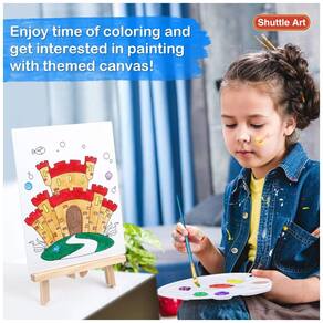 CONJUNTO DE ARTE COMPLETO DE 69 PACOTES O conjunto de pintura infantil Shuttle Art 69 Pack contém tudo o que as crianças precisam para ser um artista, incluindo 1 cavalete de mesa de madeira, 30 cores de tinta acrílica 12 ml cada, 7 telas em branco 8 x 10 polegadas, 7 temáticas telas 8 x 10 polegadas, 1 blusa tamanho M, 16 folhas de bloco de pintura acrílica 8 x 10 polegadas, 19 pincéis, 1 paleta, 1 balde de água e 1 bolsa de zenamento, tudo em um conjunto de arte para meninos e meninas .